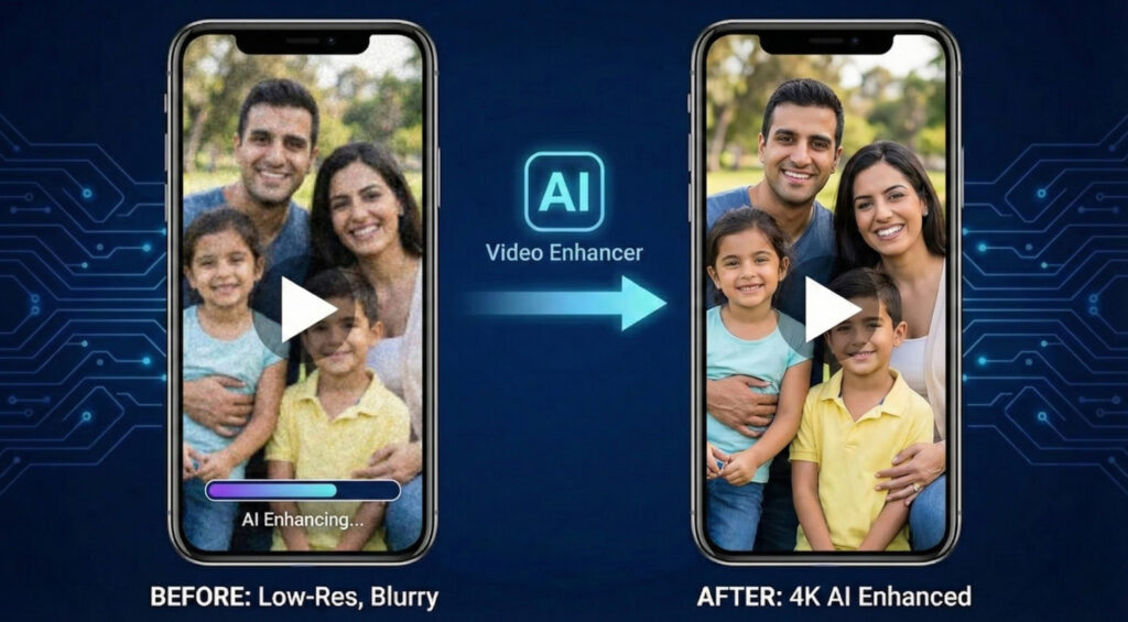 El flujo de trabajo es simple: seleccione su video de baja resolución de su galería de Android, cárguelo en la herramienta de mejora, elija 4K como destino de salida y deje que la IA procese el archivo. Una vez completado, descarga una versión revitalizada lista para la pantalla grande.