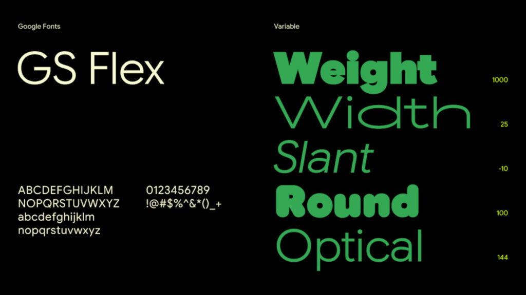 Un diseño de Google publicación de blog de 2024 sobre tipografía variable destaca la flexibilidad de la fuente. Casey Henry, diseñador de la empresa, señala que Google Sans Flex «permite que las formas de las letras de la fuente cambien de forma en diferentes escalas.” OpenType Font Variations es el estándar que utiliza Google para las fuentes variables.