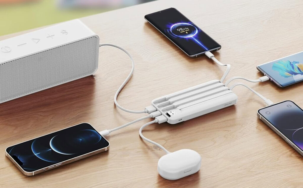 Cuenta con tres puertos USB-C de 100 W, todos los cuales pueden cargar dispositivos al mismo tiempo, además del cable superior, por lo que puede cargar cuatro dispositivos a la vez. El cable en la parte superior es extensible hasta 2,3 pies y el otro es un cable de 0,98 pies que también funciona como correa de transporte. Viene en variantes de color negro y plateado.